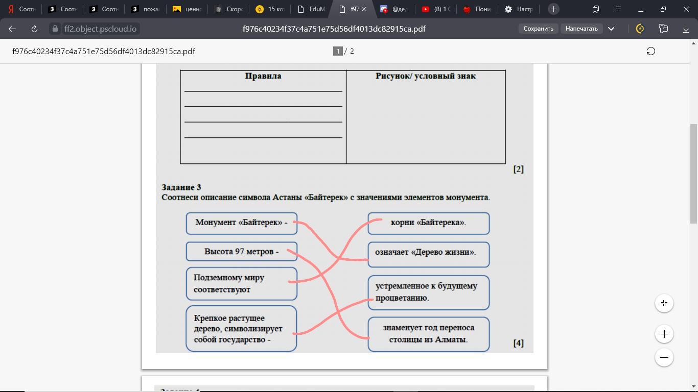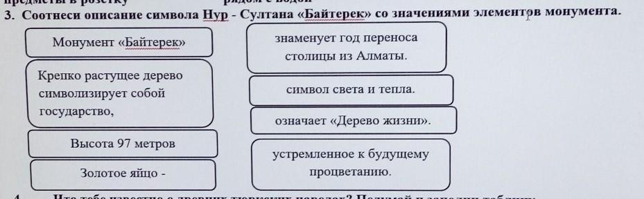 Соотнеси описание символа Нур - Султана «Байтерек» со значениями элементов монумента.