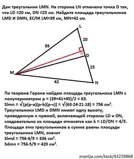 Дан треугольник LМN. На стороне LN отмечена точка D так, что LD =20 см, DN =25 см. Найдите площадь треугольников LMD И DMN, ЕСЛИ LМ=39 см, МN=42