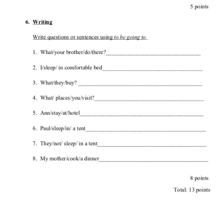 4. What/ places/you/visit?______________________________________ 5. Ann/stay/at/hotel___________________________________________ 6. Paul/sleep/in/ a tent__________________________________________ 7. They/not/ sleep/ in a tent______________________________________ 8. My mother/cook/a dinner______________________________________