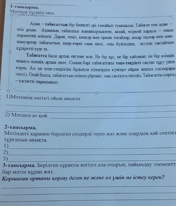 Ответ: Қоршаған ортаны қорғау қажет.Қазіргі кезде адамдар табиғатты ластайды.Қоқыс лақтырады, ауаны ластайды.Қоршаған ортаны қорғау ол әр адамның міндеті деп саналады
