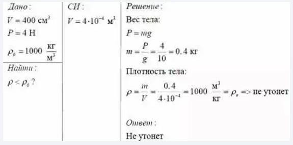 Для того, чтобы тело плавало, нужно чтобы Fа>F (при этом тело плавает на поверхности) или Fа=F (при этом тело плавает, полностью окунувшись в воду). В данном случае F=Fа=4 Н. Значит, тело не тонет, а плавает в воде.