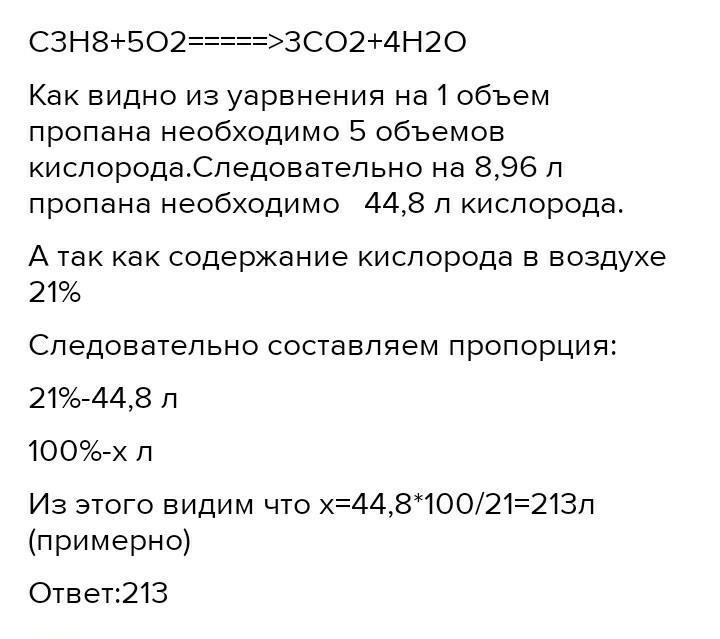 Какой объем воздуха необходимый для сжигания 40 л пропана? Объемная доля кислорода водородсодержащего воздухе 21%.