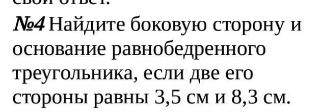 №4 Найдите боковую сторону и основание равнобедренного треугольника, если две его стороны равны 3,5 см и 8,3 см