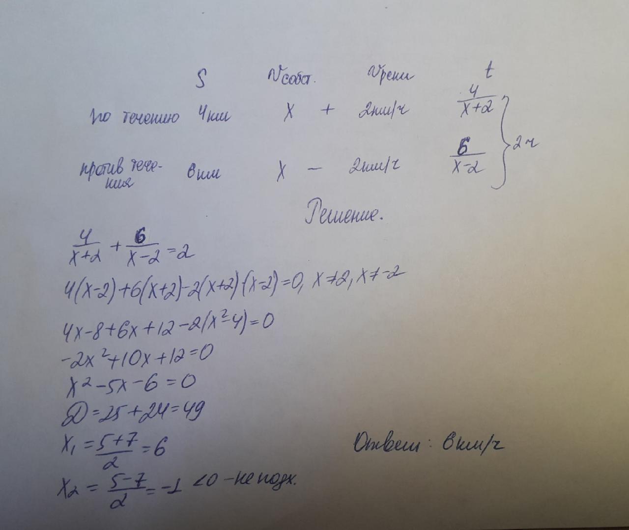Лодка проплыла 4 км по течению реки и 6 км против течения реки, потратив 2 ч на весь путь. найдите скорость лодки, плывущей по течению реки,если скорость течения реки равна 2 км / ч.