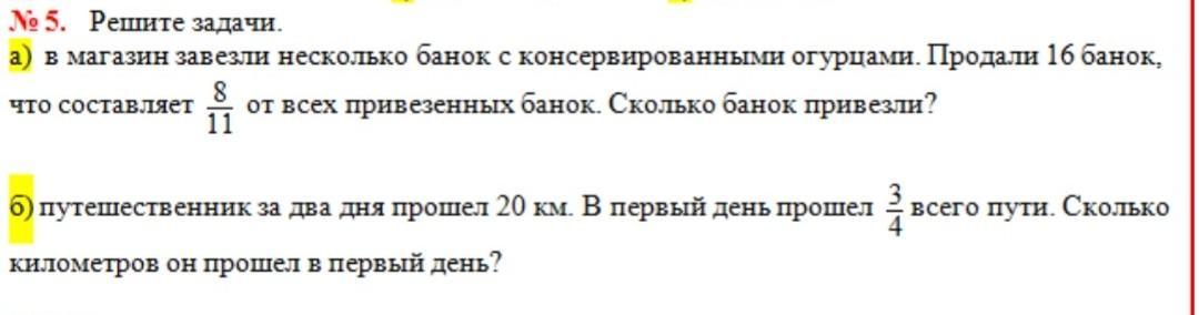 5. Решите задачи. а) в магазин завезли несколько банок с консервированными огурцами. Продали 16 банок, что составляет от всех привезенных банок. Сколько банок привезли? б) путешественник за два дня прошел 20 км. В первый день прошел всего пути. Сколько 4 километров он прошел первый день? ПОМОГИТЕ СРОЧНО