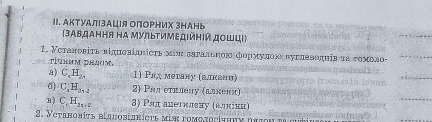 1. Установіть відповідність між загальною формулою вуглеводнів та гомологічним рядом