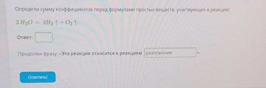 Объяснение:сумма коэффициентов =5, т.к. все коэффициенты стоящие перед формулами сумируются, если перед формулой не стоит коэффициент, то это 1, его то же прибавляем.