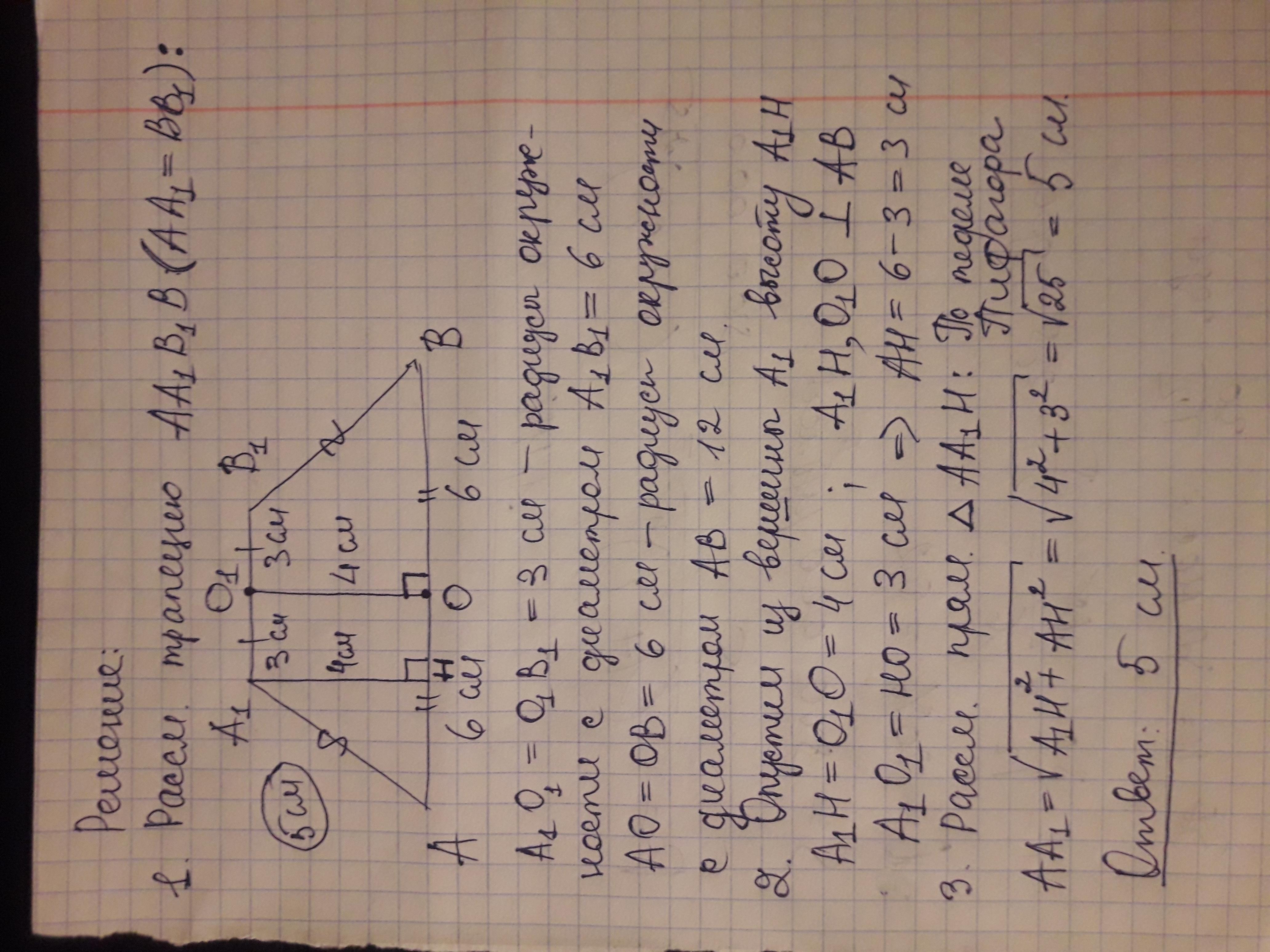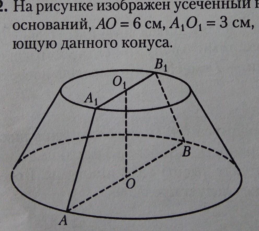 На рисунке изображен усеченный конус, точки O и O1 -центры оснований, AO=6 см, A1O1 =3 см, OO1=4 см. Найдите образующую данного конуса.