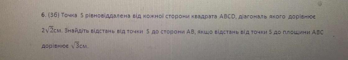 Точка S рівновіддалена від кожної сторони квадрата АВСD, діагональ якого дорівнює 2√ 2. Знайдіть відстань від точки S до сторони АВ, якщо відстань від точки S до площини АВС дорівнює √3 (помогите пжжжж!))