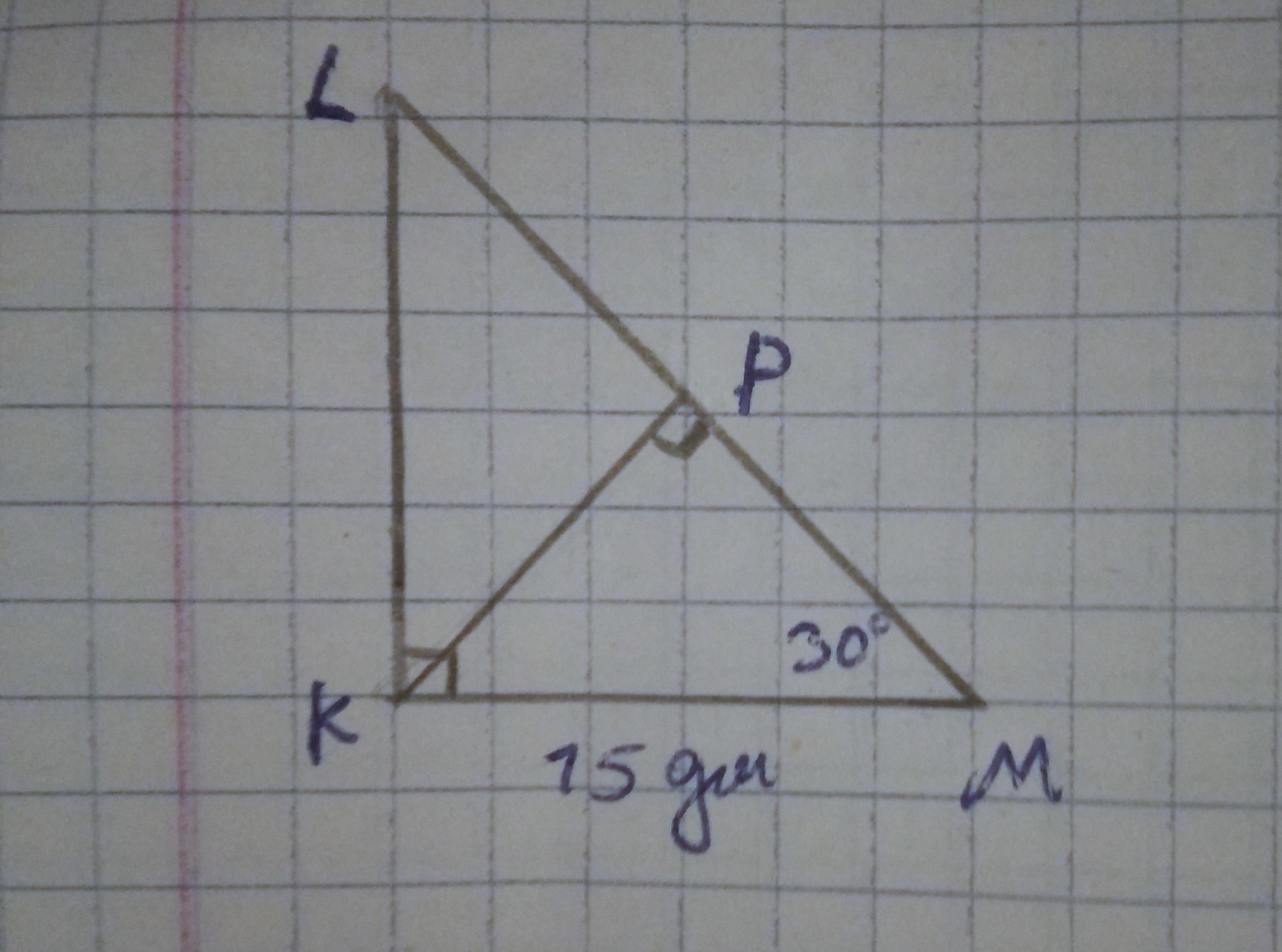 В треугольнике KLM известно, что KM=15дм,М=30°,К=90°. Найдите расстояние от точки К до прямой LM.