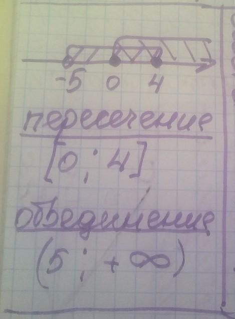 Изобразите на координатной прямой и запишите пересечение и объединение числовых промежутков: (–5; 4] и [0; +∞) .