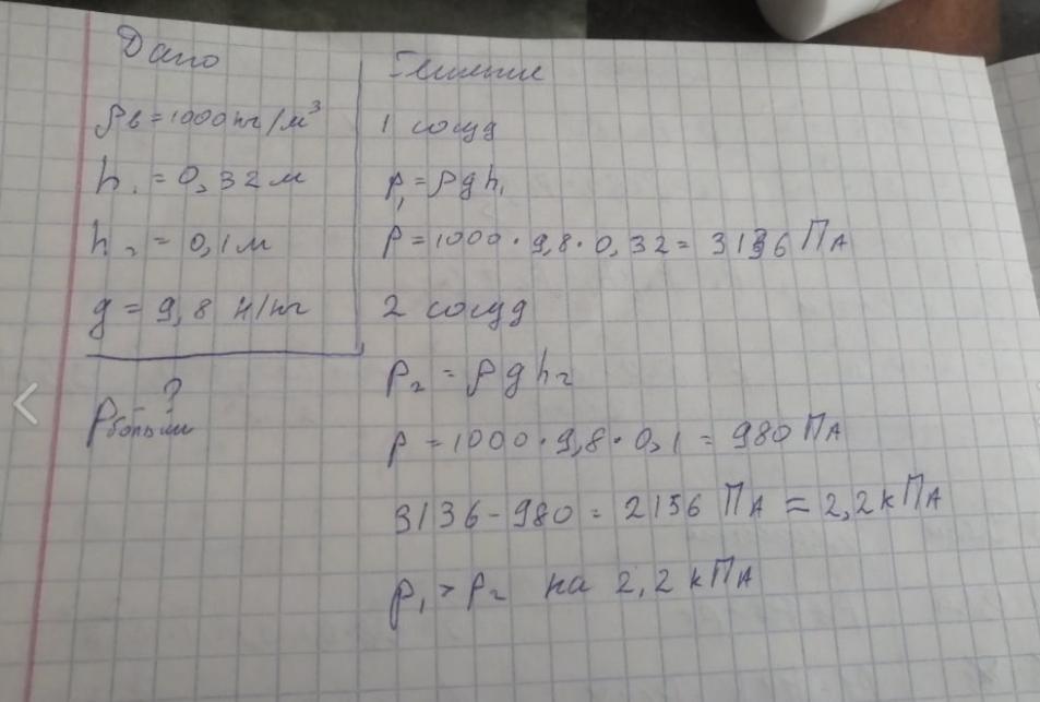 давление в первом сосуде 2,1 кПа больше, чем во втором. ( первый сосуд - это где 32см) (это если округлять изначально до кПа)