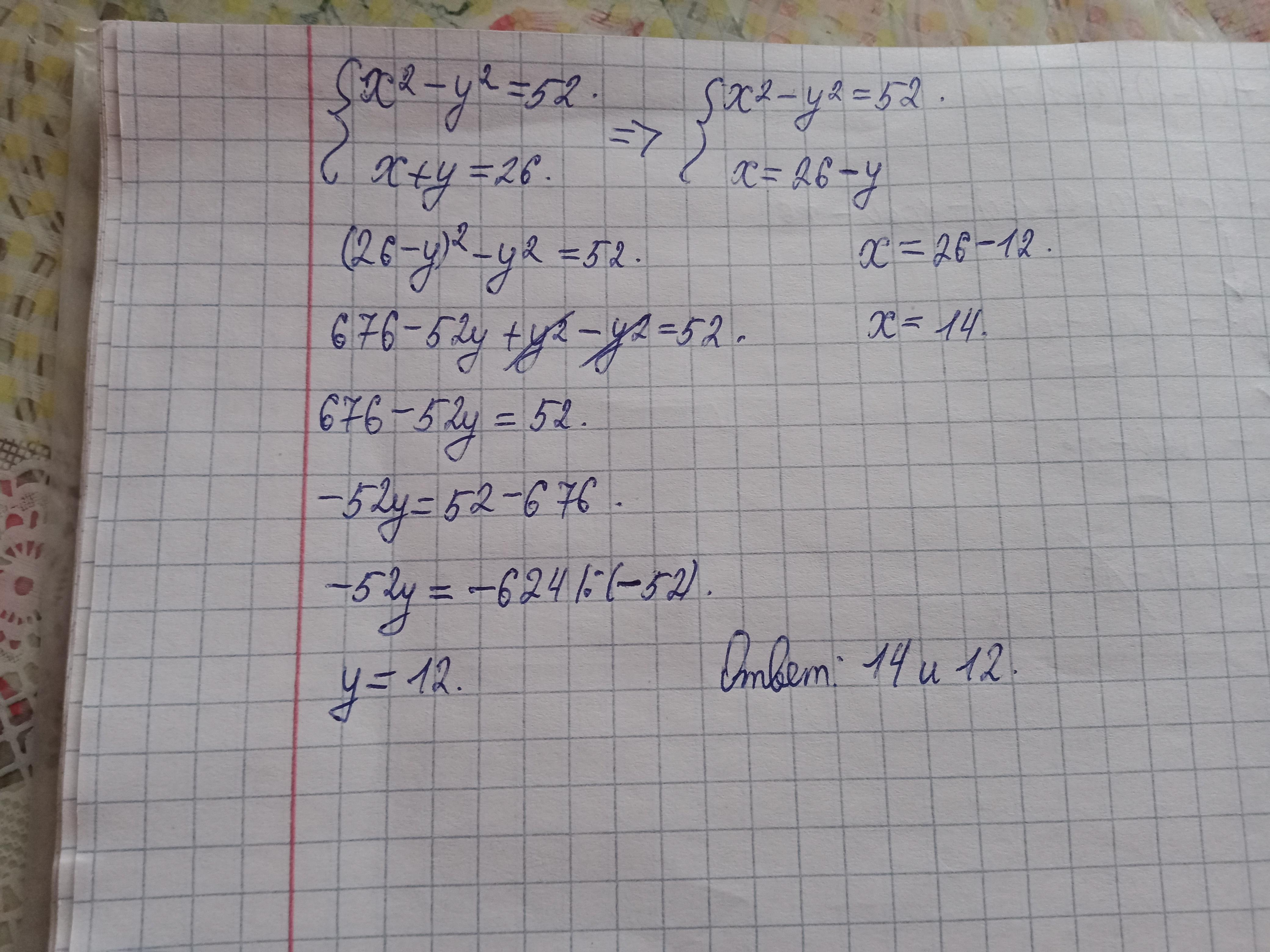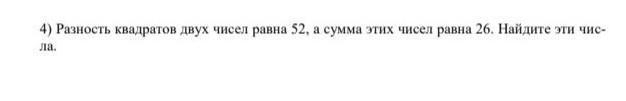 4) Разность квадратов двух чисел равна 52, а сумма этих чисел равна 26. Найдите эти числа.