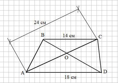 в трапеции ABCD известно,что AD=18см, ВС=14 см, АС=24см. Найдите отрезки на которые диагональ АС делится точкой пересечения диагоналей