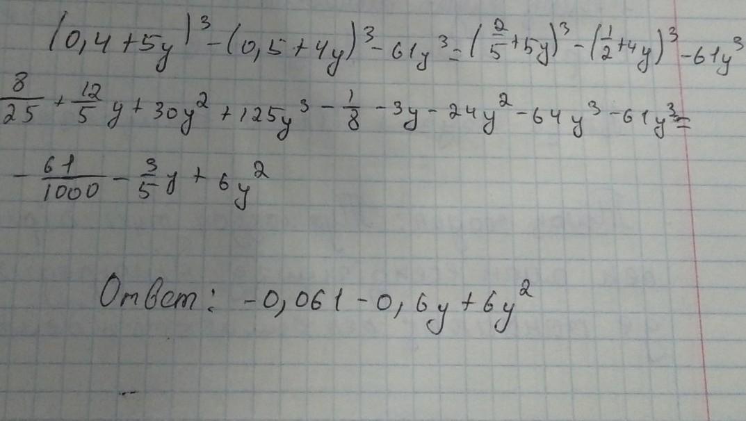 3. Упростите выражение: (0,4 + 5y)^3 - (0.5 + 4y)^3 - 61y^3 и найдите его значение при y = -1.