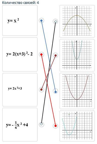 4. у = -1/4 · х² + 4 - ветви этой параболы направлены вниз (-1/4 < 0), график ее можно получить, отразив график функции у = х² относительно оси Ох (получим график функции у = -х²), "растянув" в 4 раза график функции у = -х² вдоль оси Ох и сдвинув его на 4 единицы вверх вдоль оси Оу, т.е. ее график -это а (коричневого цвета).