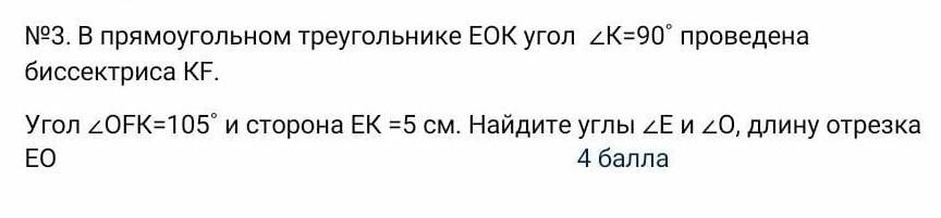 Биссектриса FK— делит прямой угол на 2 равные стороны, тоесть: ∠FKE = 90/2 = 45° ⇒