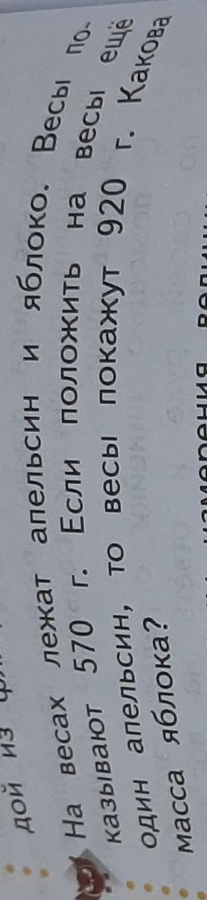 вычеслили массу апельсина,потом от общей массы отняли массу двух апельсин,и получили массу яблока