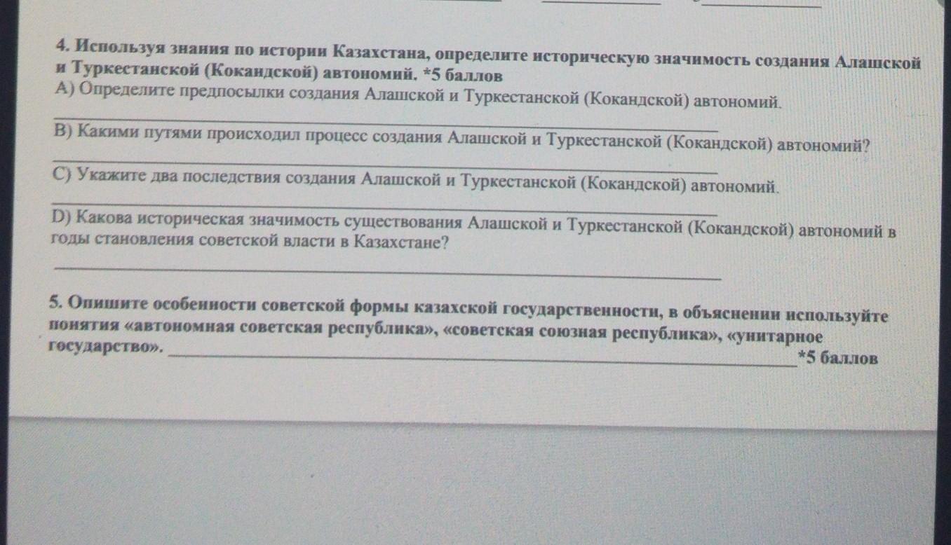 4)С конца XIX века национально-освободительная борьба казахского народа вступила в новый этап, по-прежнему происходили народные выступления за восстановление на колониальных порядков.Протестное движение получило новое идейно-политическое содержание. Лидеры "Алаш" боролись за объединение казахского этноса в нацию его создание казанской государственной формы автономии в составе демократической России.