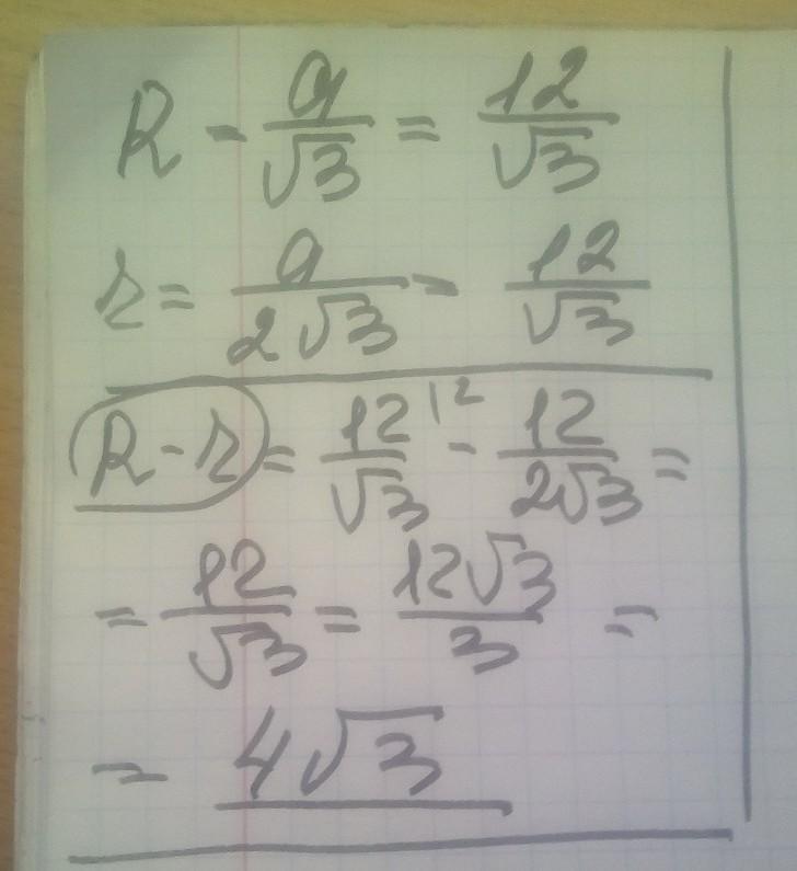 Дан правильный треугольник со стороной, равной 12.Найдите разность R-r, где R- радиус описанной окружности, r -радиус вписанной окружности треугольника