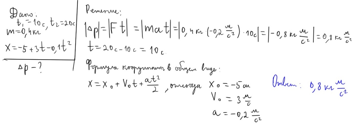 Тело массой 0,4 кг движется вдоль оси ОХ так , что его координаты меняются со временем за законом х= -5 +3t-0,1t²( координата задана в метрах) . Чему равняется модуль смены импульса тела за время t1 = 10c до t2 =20 c ?