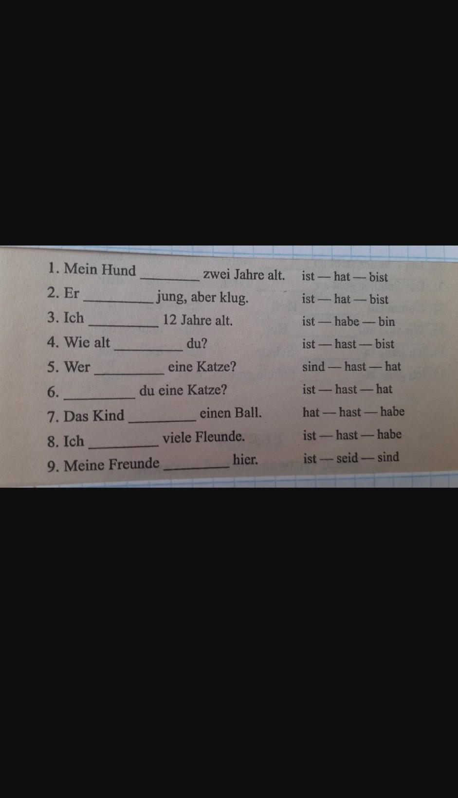 1. ist, 2. ist 3 bin 4 bist 5 hat 6 hast 7 hat 8 habe 9 sind