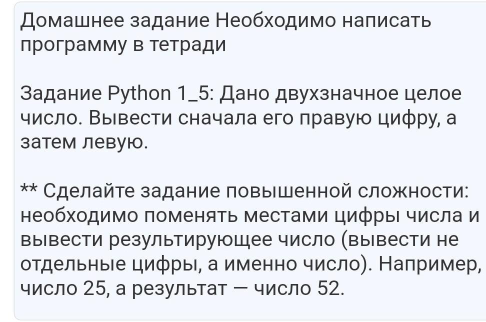 ** Сделайте задание повышенной сложности: необходимо поменять местами цифры числа и вывести результирующее число (вывести не отдельные цифры, а именно число). Например, число 25, а результат — число 52