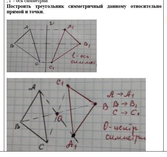 В данном задании нужно просто построить 2 симметричные фигуры.во 2 чертеже 2 симметричных треугольника, по данной схеме можно начертить любую фигуру.