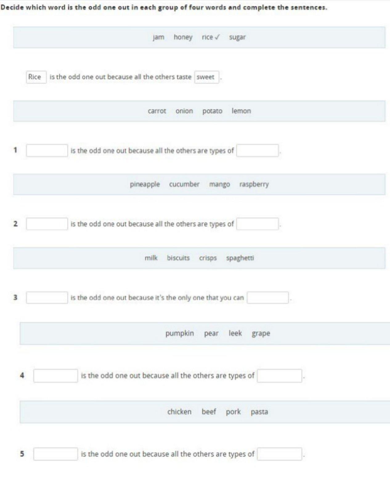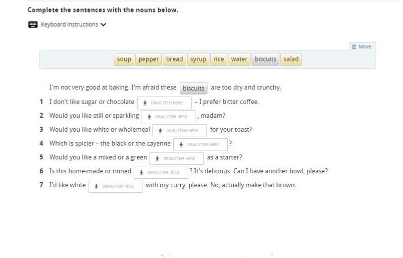 1 syrup water 3 rice 4 pepper 5 salad 6 soup 7 bread 0 lemon 1 cucumber 2 milk 3 grape 4 pasta 5 rice