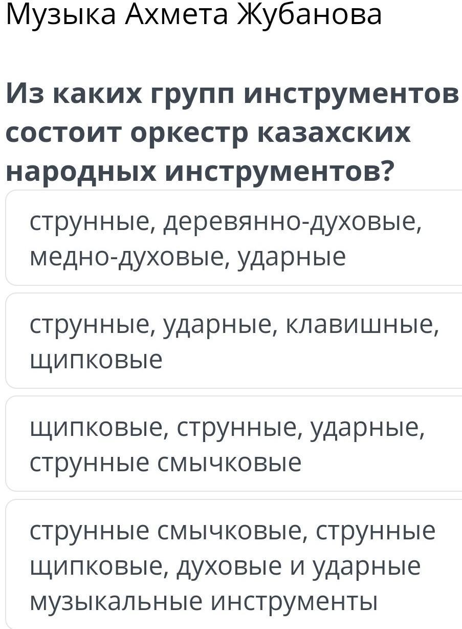 струнные смычковые, струнные щипковые,духовые и ударные музыкальные инструменты