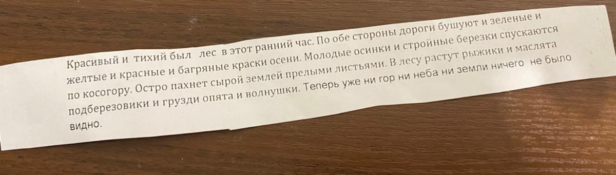 Красиво (наречие; одн. _._._), тихо (наречие; одн. _._._) было (гл. = ) в (предлог) лесу (сущ. _._._) в (предлог) этот (местоим. ~) ранний (прилагат. ~) час (сущ. _._._). По (предлог) обе стороны (числ., сущ. _._._) дороги (сущ. _ _ _), бушуют (гл. = ) зелёные (прилагат., одн. ~), жёлтые (прилагат., одн. ~), красные (прилагат., одн. ~) и (союз) багровые (прилагат., одн. ~) краски (сущ.) осени (сущ. _ _ _). Молодые (прилагат. ~) осинки (сущ., одн. подлежащее) и (союз) стройные (прилагат. ~) берёзки (сущ., одн. подлежащее) спускаются (гл. = ) по (предлог) косогору (сущ. _ _ _). Остро (наречие _._._) пахнет (гл. = ) сырой (прилагат. ~) землёй (сущ. одн. _ _ _), прелыми (прилагат. ~) листьями (сущ. одн. _ _ _). Из (предлог) вороха (сущ. одн. _ _ _) старых (прилагат. ~) листьев (сущ. _ _ _), из (предлог) травы (сущ. одн. _ _ _) и (союз) из (предлог) валежника (сущ. одн. _ _ _) выглядывают (гл. = ) грибы (сущ.). В (предлог) лесу (сущ. _._._) растут (гл. = ) рыжики (сущ., одн. подлежащее), маслята (сущ., одн. подлежащее), подберёзовики (сущ., одн. подлежащее), грузди (сущ., одн. подлежащее), опята (сущ., одн. подлежащее) и (союз) волнушки (сущ., одн. подлежащее).