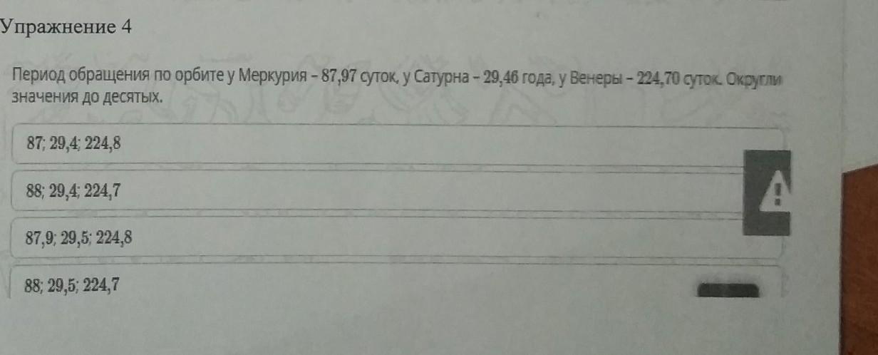Период обращения по орбите у Меркурия – 87,97 суток, у Сатурна – 29,46 года, у Венеры – 224,70 суток. Округли