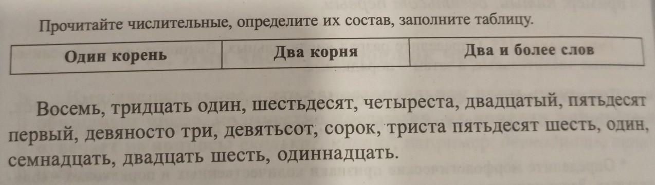 Прочитайте числительные, определите их состав, заполните таблицу.