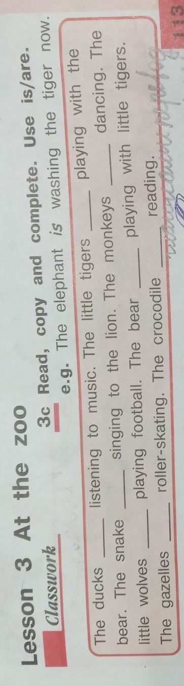 The ducks ..... listening to music. The little tigers ....... playing with the bear. The snake ...... singing to the lion. The monkeys dancing. The little wolves ........ playing football. The bear ........ playing with little tigers. The gazelles ...... roller-skating. The crocodile ....... reading.