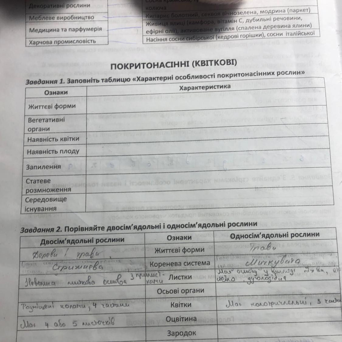 Завдання 1. Заповніть таблицю «Характерні особливості покритонасінних рослин»