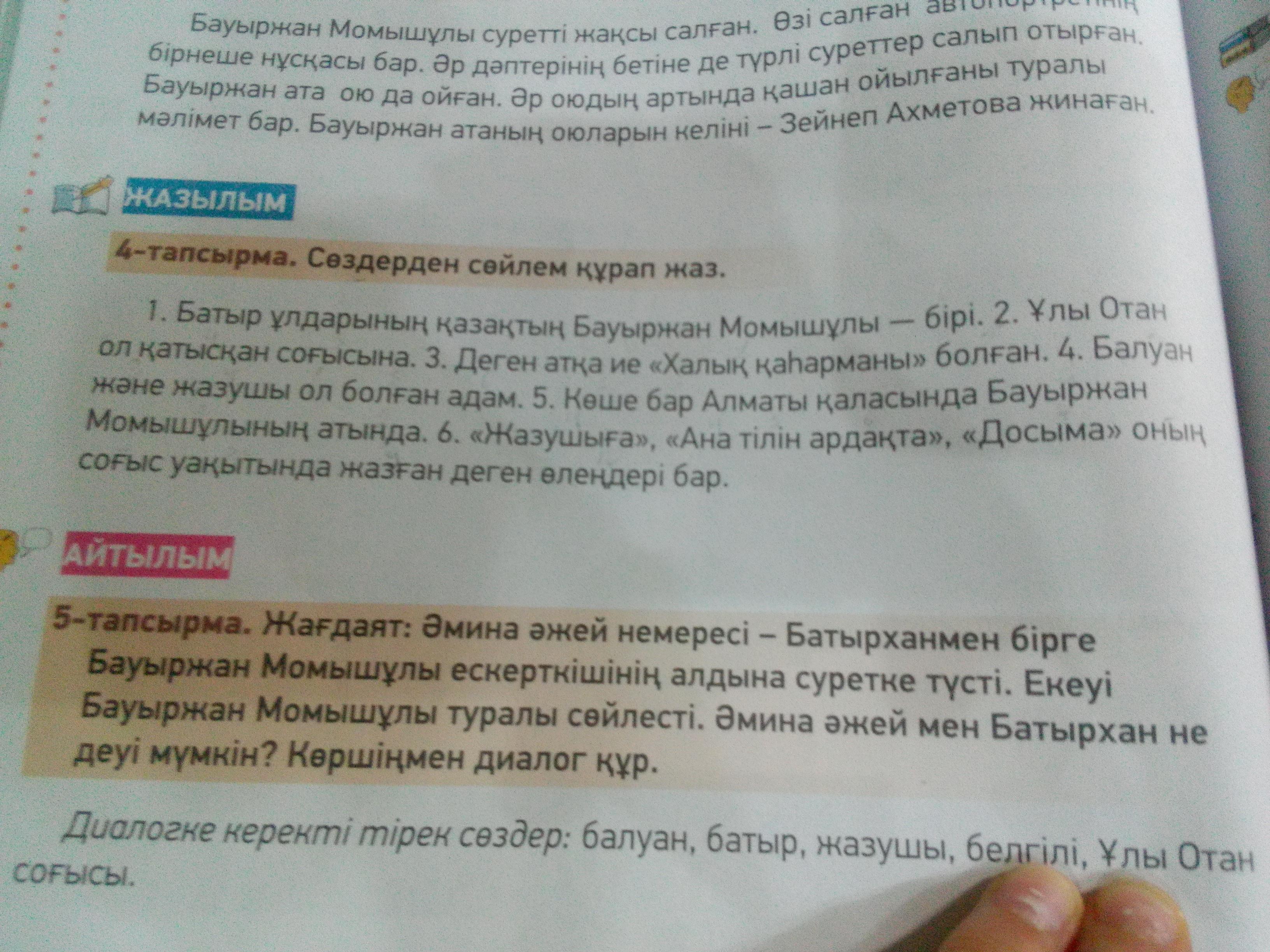 там слова перепутынное нужно их составить правильно.Пример:Қазақтың батыр ұлдарының бірі Бауыржан Момышұлы. Поставьте 5 пж