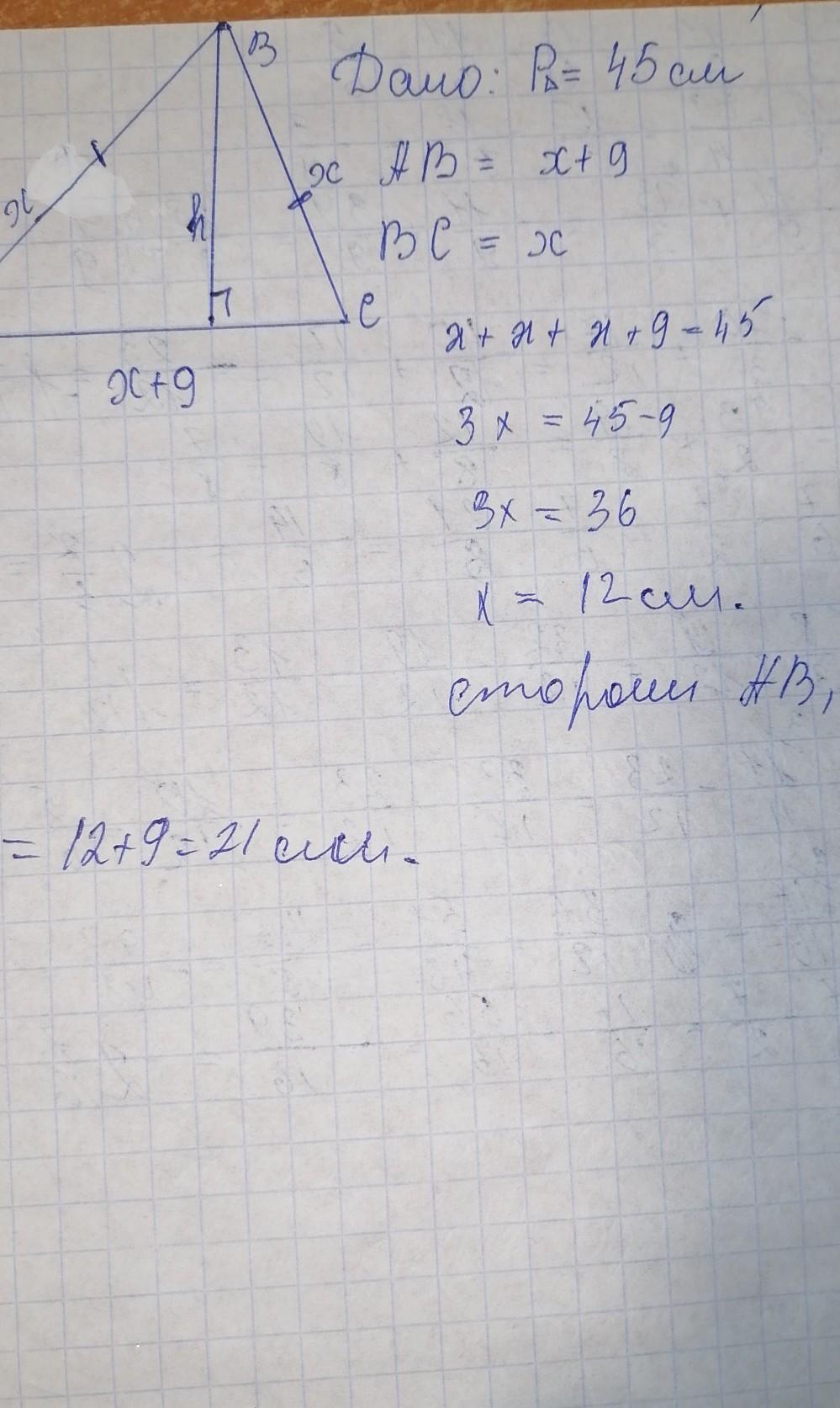 Периметр равнобедренного тупоугольного треугольника равен 45см, а одна из его сторон больше другой на 9см, Найти стороны треугольника.