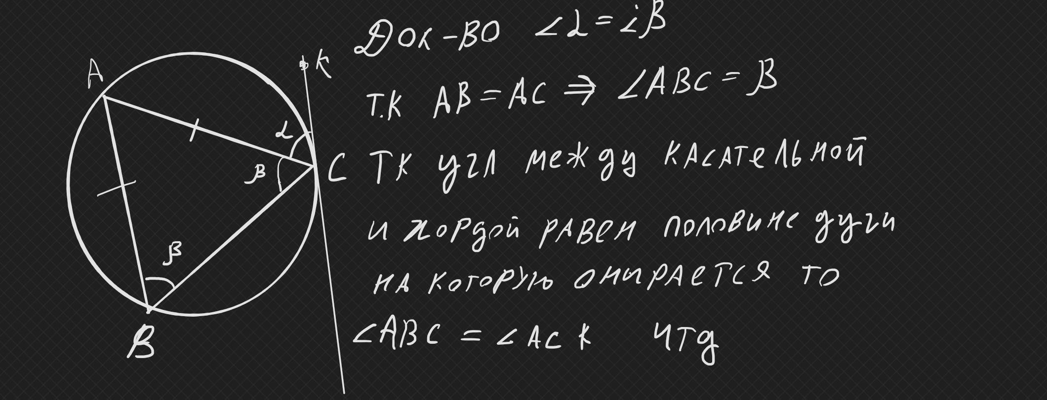 из условия мы знаем что он равнобедренный значит углы при основании угл между касательной и хордой равен половине дуге на которую он опирается. Так как вписанный тоже равен половине дуге на которую он опирается то можем увидеть такое равенство bca=abc=ack