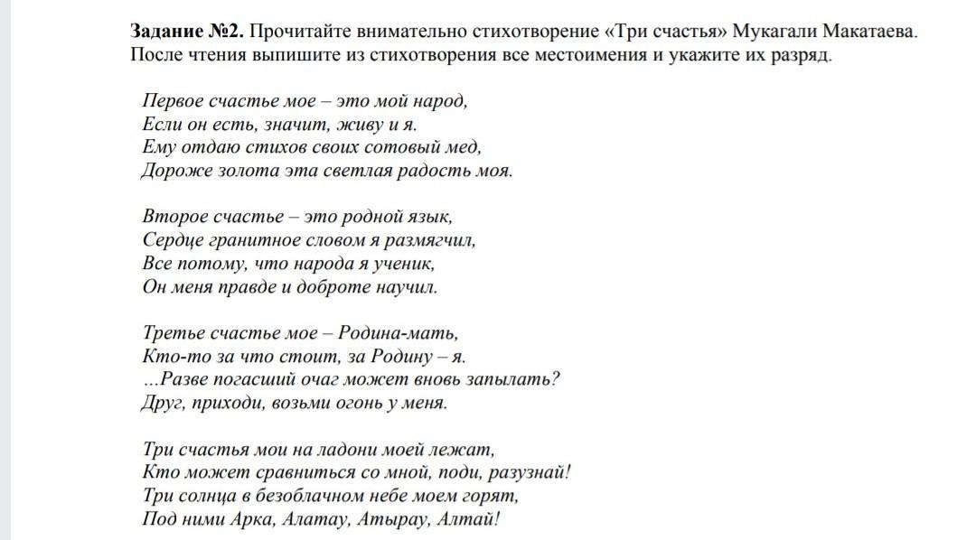 прочитайте внимательно стихотворение три счастья мукагали макатаева после чтения выпишите из стихотворения все местоимения и укажите их разряд