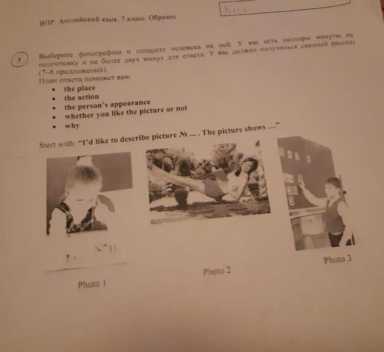 I'd like to describe picture number one. In the picture we see a little girl. I think she is in elementary school. The girl is sitting in the classroom. She is writing an exercise. She is wearing a dress and a white blouse. She has got long fair hair. I like this picture because the girl looks kind, she is smiling. I think she likes studying at school and she is a good student.