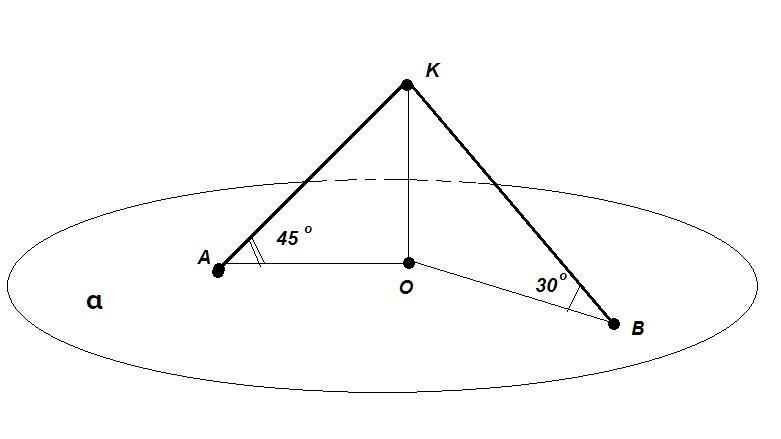 Из точки k, которая лежит вне плоскости альфа, проведены к этой плоскости наклонные ka и kb, образующие с ней углы 45° и 30° соответственно. найдите длину проекции наклонной kb на плоскость альфа, если ka=8√6см.