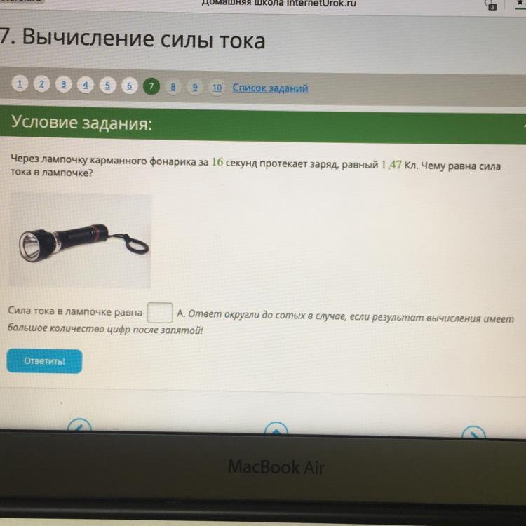 ВЫРУЧАЙТЕ ПОЖАЛУЙСТА СРОЧНО!!!!!Через лампочку карманного фонарика за 16 секунд протекает заряд, равный 1,47 Кл. Чему равна сила
