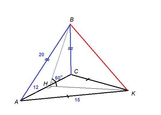 угол между плоскостями треугольников АБС и АКС равен 60°, Ас=24 см, БС=БА=20 см, КС=КА=15 см. Найдите отрезок БК.