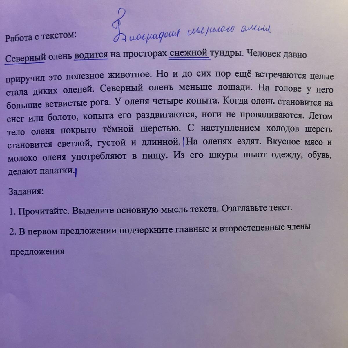 Основная мысль: в тексте рассказывается о северных оленях. Чем они полезны и как люди употребляют его дары.