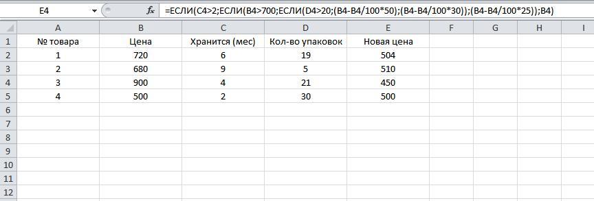 =ЕСЛИ(C4>2;ЕСЛИ(B4>700;ЕСЛИ(D4>20;(B4-B4/100*50);(B4-B4/100*30));(B4-B4/100*25));B4)