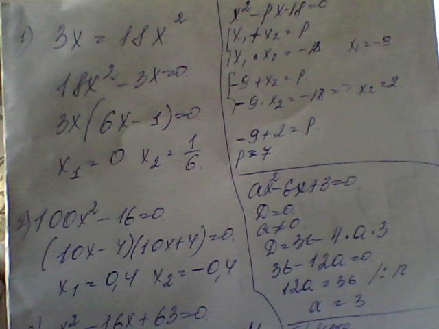 1)3х=18х² 3х-18х²=0 3х(1-6х)=0⇒х=0 и х=1/6