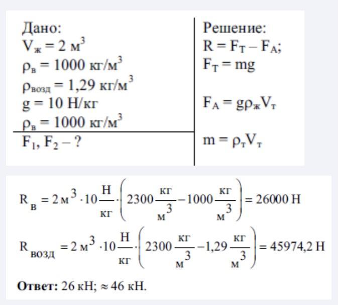 Кусок мрамора объëмом 2 м3 полностью погружён в воду. Какую силу необходимо приложить, чтобы удержать его в воздухе; в воде?