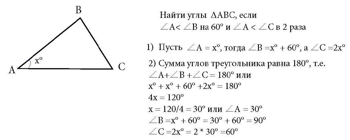 Пусть ∠ А = х°, тогда ∠ В =х +60°, ∠ С = 2х°