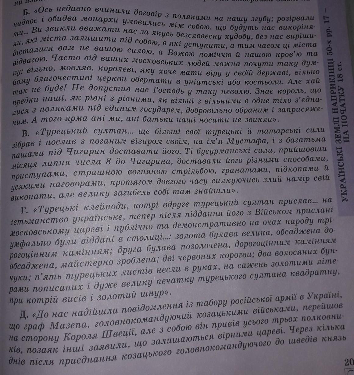 Д) гетьман Мазепа уклав союз з Шведським королем, чим виступив проти царя, знищення Батурина і Січі, битва під Полтавою( просто я не знаю що там далі, бо це не весь документ)