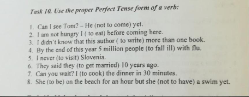 1. hasn't come. 2. had eaten. 3. had written. 4. had falllen ill 5. I have never visited Slovenia. 6. had married. 7. will have cooked. 8. has been, hasn't had